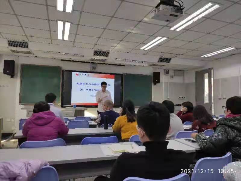 沈经理围绕近期学校和学院工作进行总结部署。首先向全体教师传达了学校关于2021年年度考核工作安排,并就教师职称评审与聘用实施办法征求意见稿、学院教学团队设计等工作进行介绍。沈经理要求全体教师要高度重视教学质量,要从教学文件准备、仪表着装、教学设计、课堂管理等方面进行教学全过程管理,可用思维导图等方法对教学进行梳理和反思;全体教师要注意科研与教学工作的联系,重视课程思政建设;要密切围绕学院的发展方向进行科学研究和论文撰写,重视国家自然基金项目申报。随后,沈经理带领大家集体学习了《国家体育总局十四五规划》,要求全体教师要深入学习总局十四五规划精神,明确自己的研究方向,抓住“体育科技”发展的机遇,从师德师风、教学能力、科学研究等方面全面提升自身的能力。