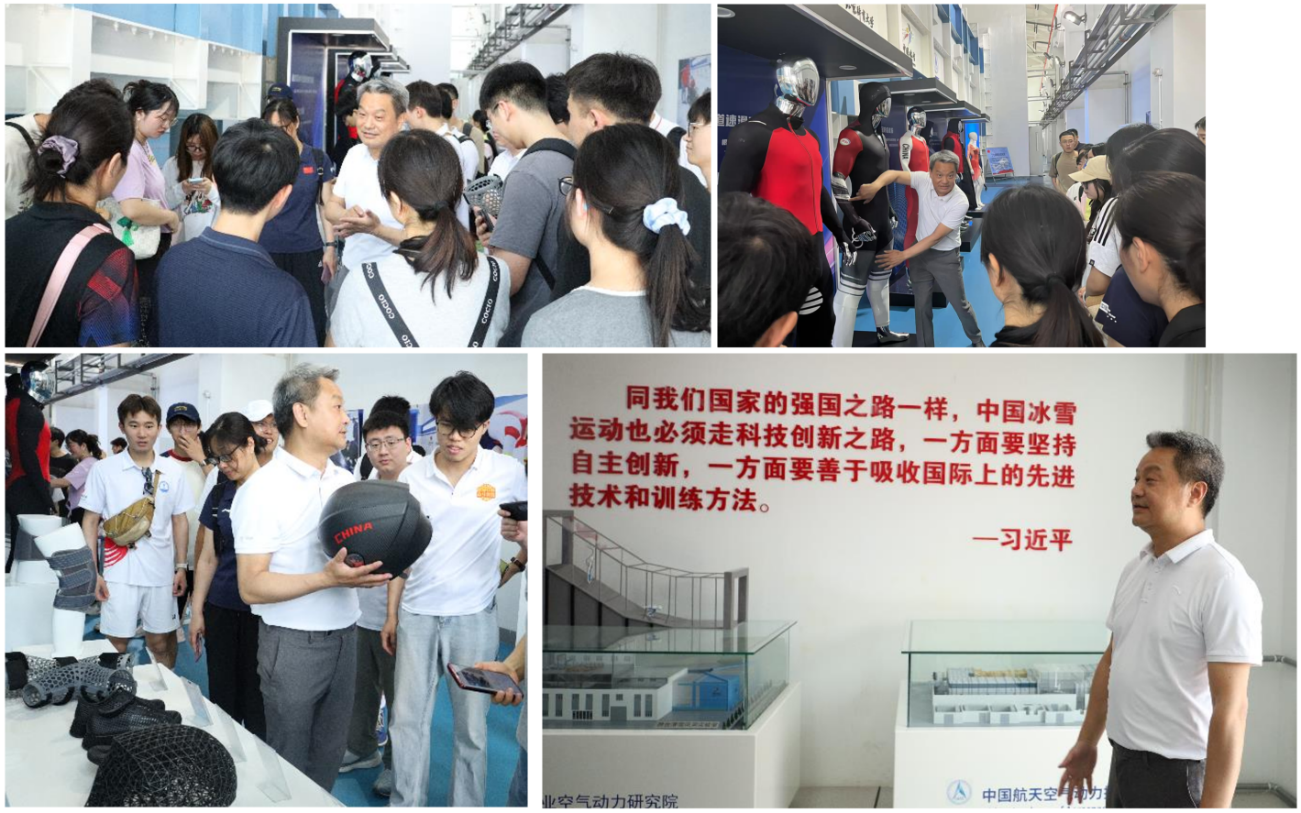 洪平副董事长在综合风洞馆向同学们介绍科技创新在冰雪运动装备中的应用,包括碳纤维材料应用、利用3D打印技术定制装备、风洞实验室在测试装备性能和运动员姿态中的重要作用以及个性化定制、防切割技术在运动服装中的应用,强调科技创新对于提升运动表现和运动安全的重要性,鼓励同学们要打破学科壁垒,促进多领域融合。另外,同学们还实地体验了风洞技术模拟比赛环境。