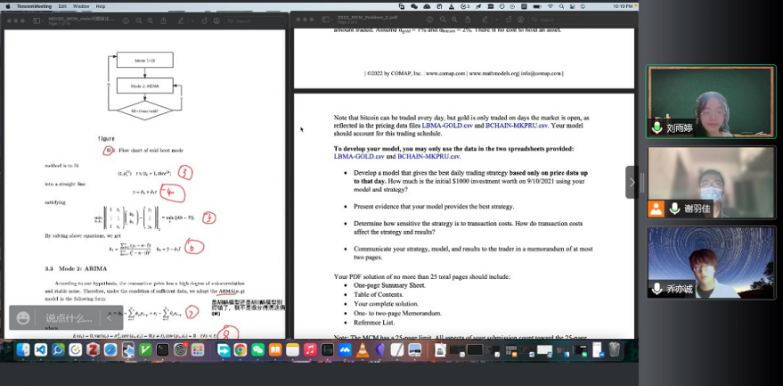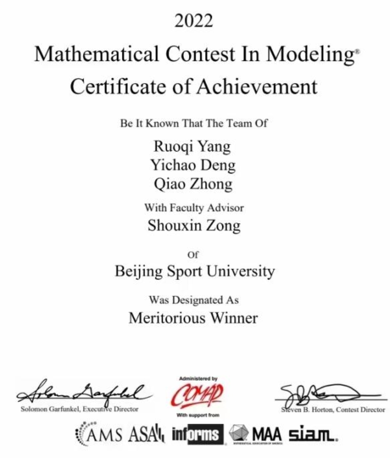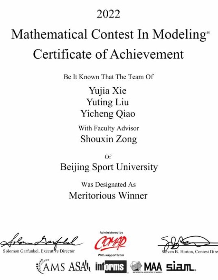 本届竞赛于北京时间2022年2月17日至21日全球同步进行,赛程历时96小时,参赛者须完成建模、求解、验证以及全英文论文撰写等竞赛内容。全方位考察参赛选手研究问题、解决问题、论文写作能力及团队合作状况等。在特殊时期,面对考验队员们克服困难,积极沟通,查阅大量相关学科的书籍和参考资料,充分运用两个月的备赛时间中的积累知识灵活进行建模,最终取得了一等奖的优异成绩。
