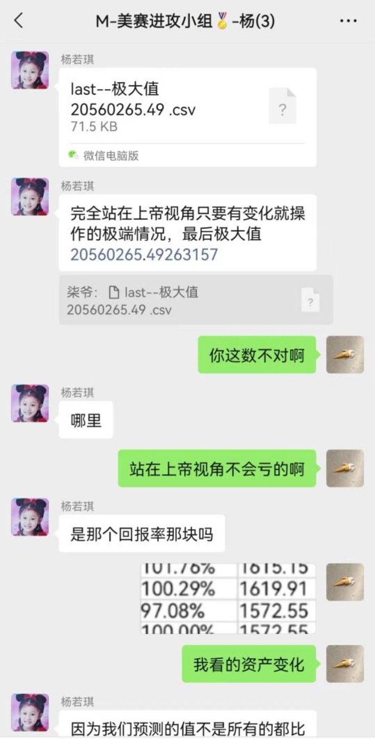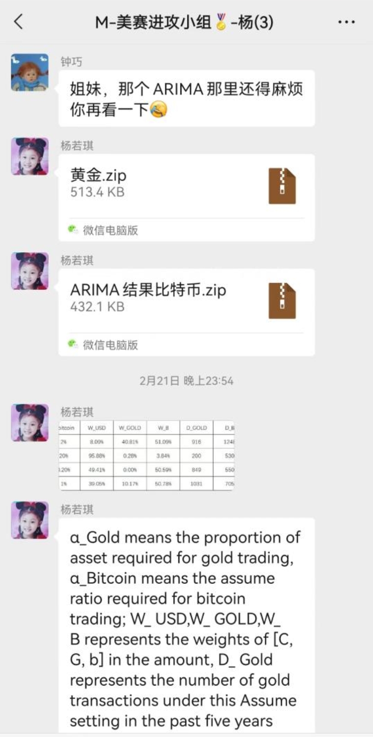 本次数学建模大赛两组同学都选择了C题:比特币与黄金价格预测与投资策略制定。杨若琪组在五日均线操盘法的基础上依据乖离率构建风险衡量指标,拟合牛熊市场判定指标,综合评判当前市场投资风险情况。依据金融市场仅在短期内具有客观规律改进遗传一阶微分GM<1,1>,进行投资产品价值预测,同时对比ARIMA算法取得了更优效果。在决策部分,在预测部分得出的风险指标基础之上结合夏普比例综合考量购买者风险承受能力以及资金基本状况做出决策。