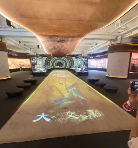 进入第二展厅大交融,映入眼帘的是画有丝绸之路图案的地毯以及边缘刻有神兽图案的圆盘,讲解员先后介绍艺术共美、生活互融、丝路贸易、节日风俗四个专区,在节日风俗区,我们看到了源于壮族的特殊节日——《三月三》,以及壮族的民族服装,还有傣族的泼水节等等。